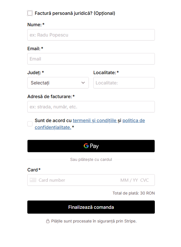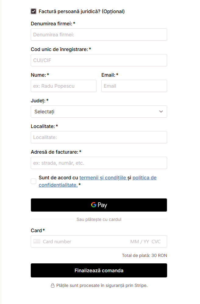 Introduci denumirea firmei, CUI/CIF și adresa de facturare, apoi finalizezi comanda.